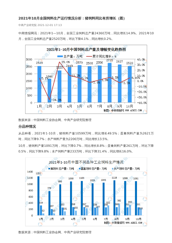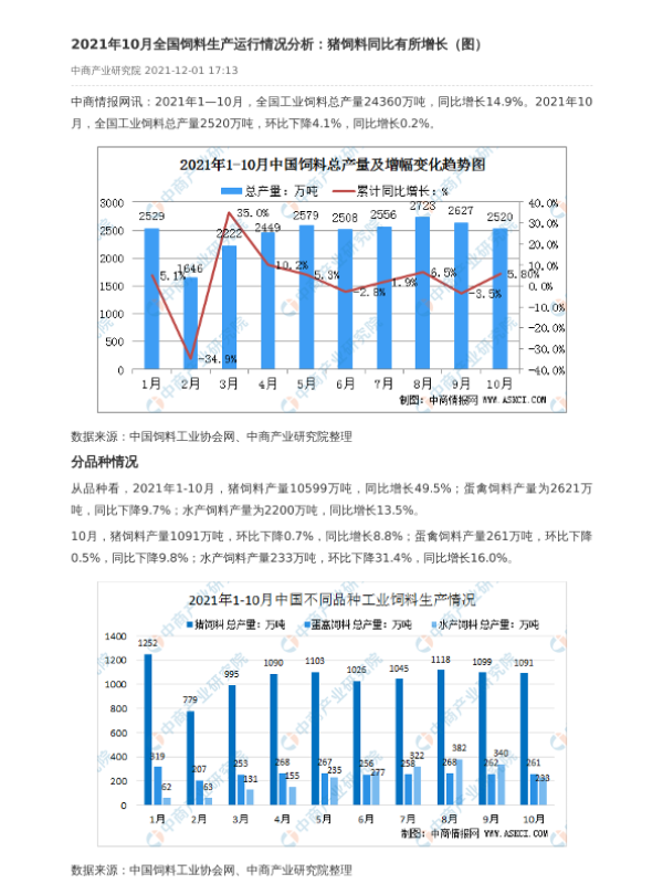 【中商产业研究院】【20211201】2021年10月全国饲料生产运行情况分析:猪饲料同比有所增长(图)-2页