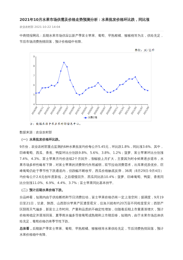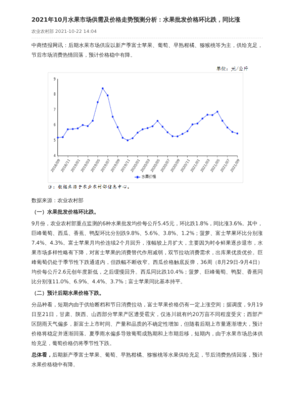【中商产业研究院】【202110】2021年10月水果市场供需及价格走势预测分析-1页