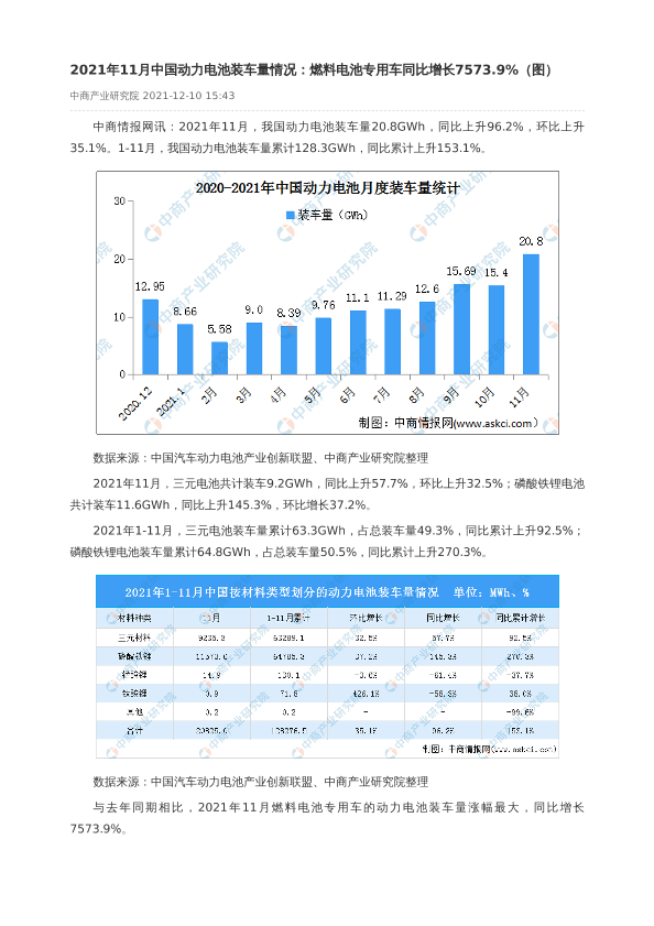 【中商产业研究院】【20211210】2021年11月中国动力电池装车量情况:燃料电池专用车同比增长7573.9%-2页
