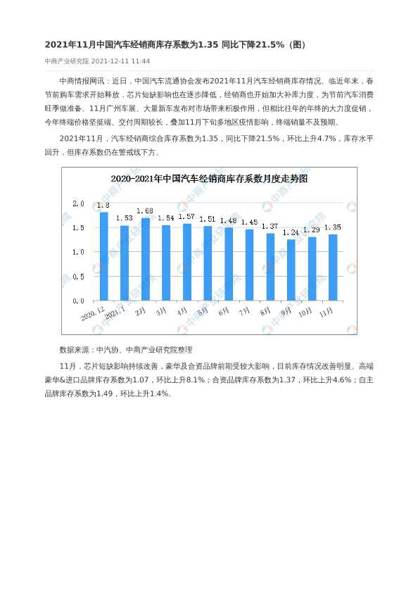 【中商产业研究院】【2021】2021年11月中国汽车经销商库存系数为1.35 同比下降21.5%-2页