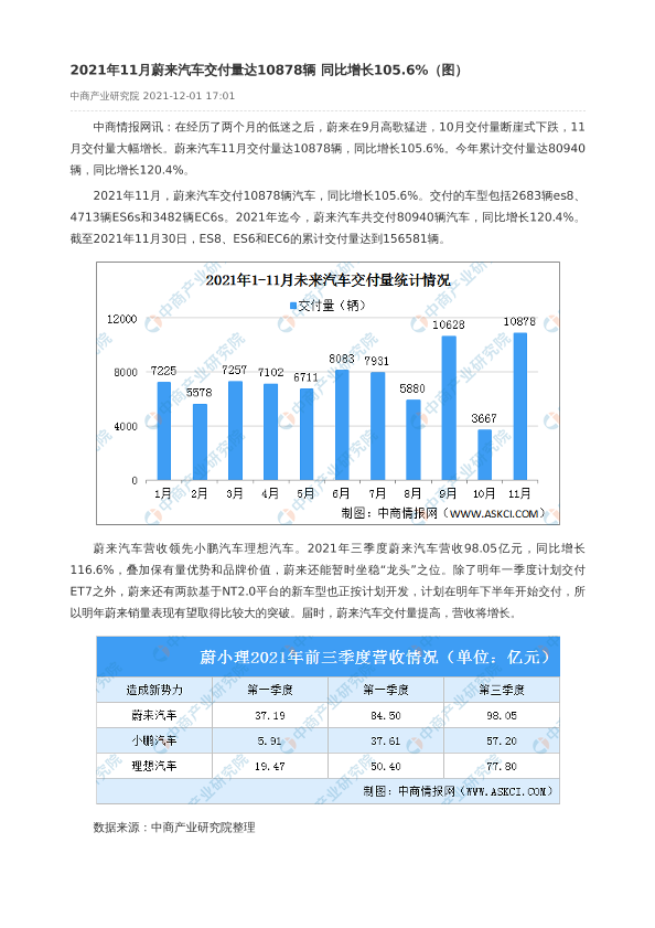 【中商产业研究院】【2021】2021年11月蔚来汽车交付量达10878辆 同比增长105.6%-1页