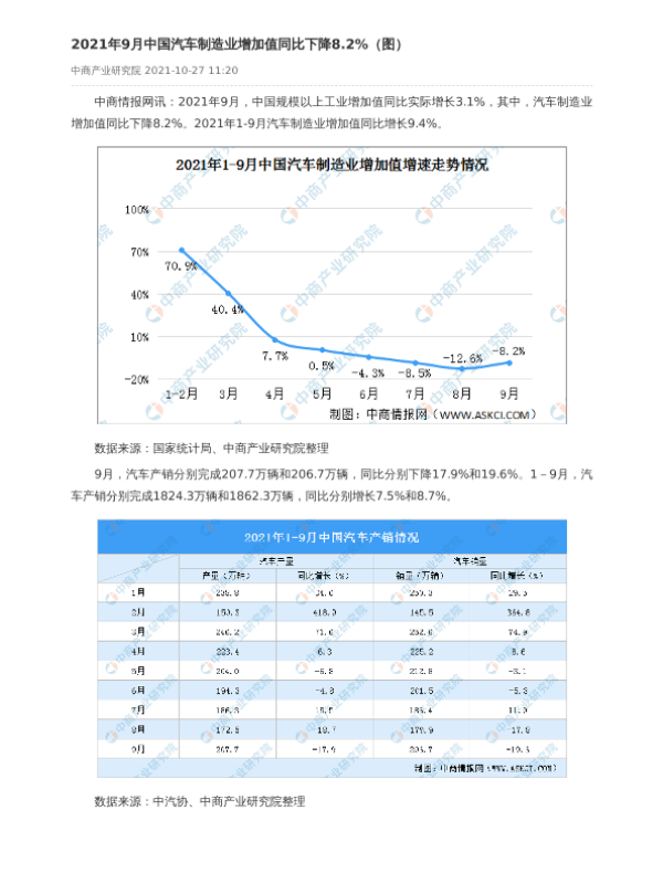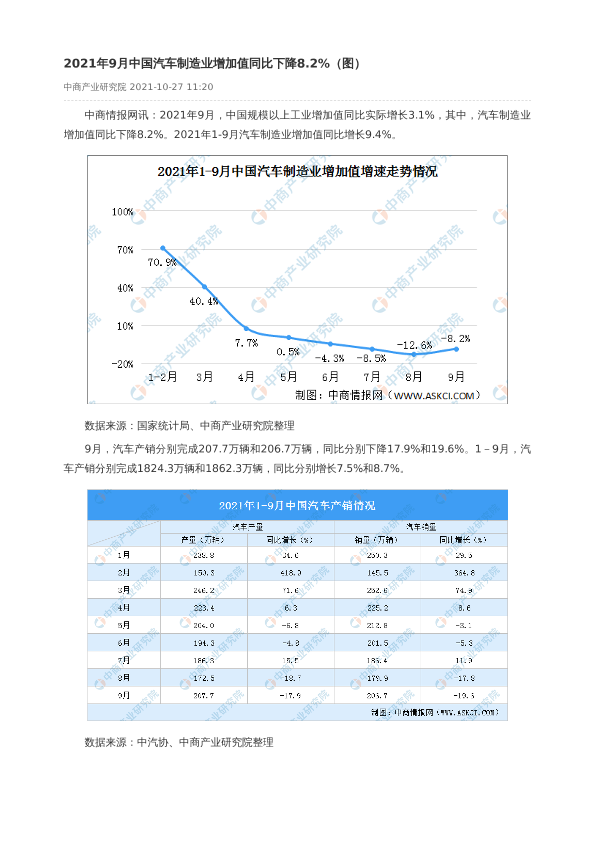 【中商产业研究院】【2021】2021年9月中国汽车制造业增加值同比下降8.2%-1页