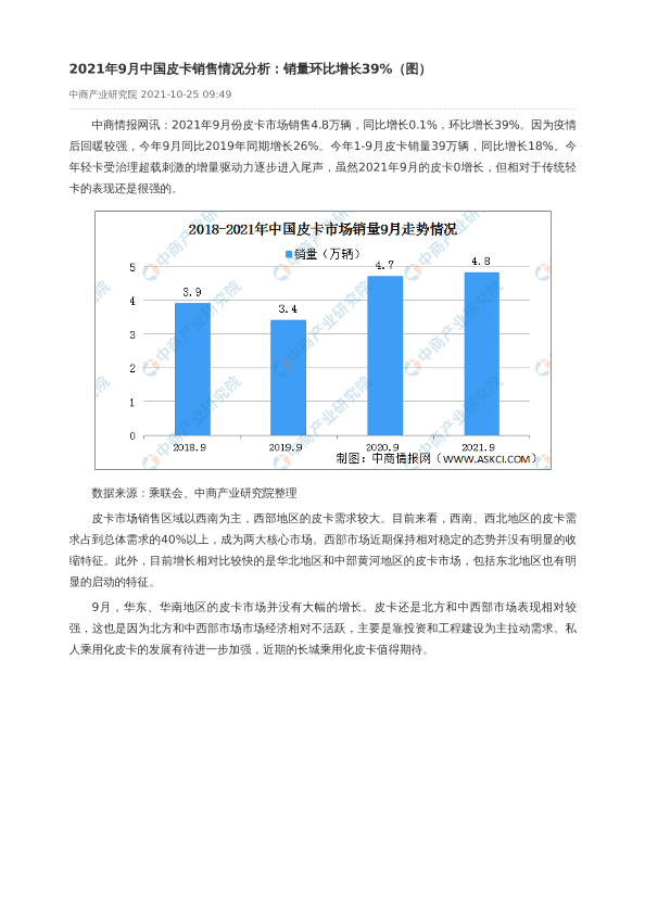 【中商产业研究院】【20211025】2021年9月中国皮卡销售情况分析:销量环比增长39%-2页