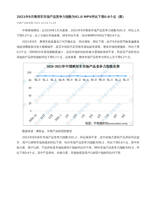 【中商产业研究院】【202109】2021年9月乘用车市场产品竞争力指数为91.0 MPV环比下滑0.6个点(图)-2页