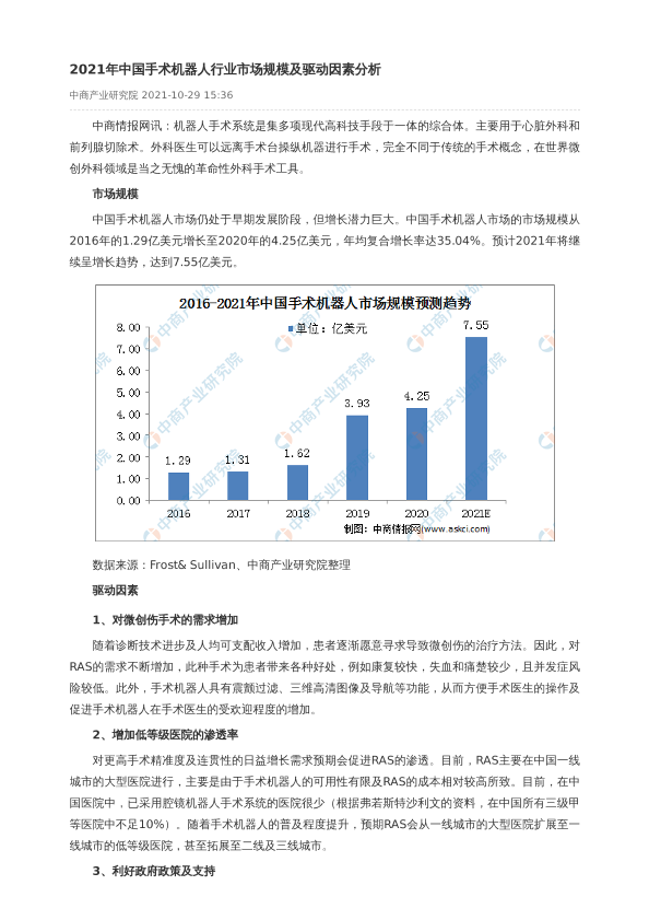 【中商产业研究院】【2021】2021年中国手术机器人行业市场规模及驱动因素分析-2页