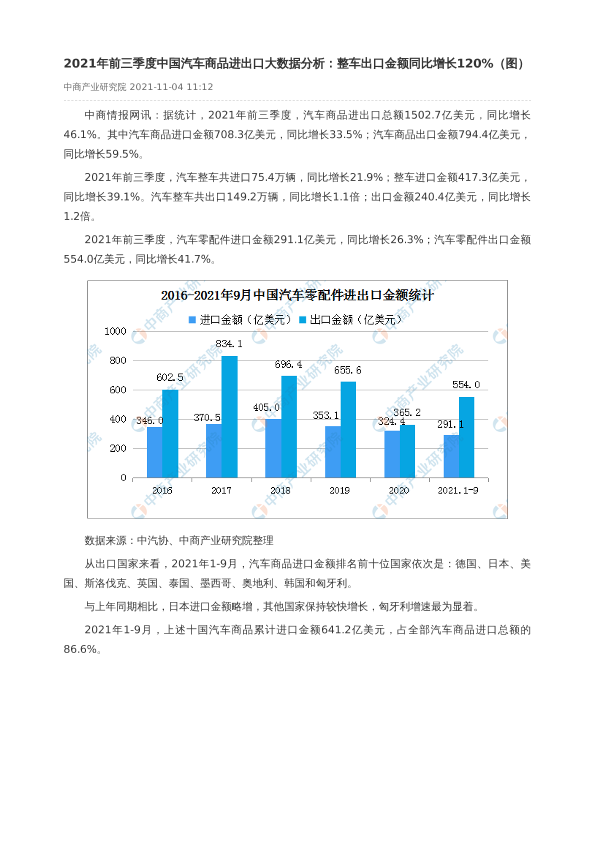 【中商产业研究院】【20211104】2021年前三季度中国汽车商品进出口大数据分析:整车出口金额同比增长120%-1页