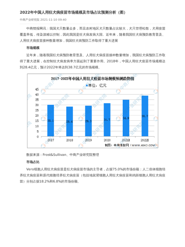 【中商产业研究院】【2022】2022年中国人用狂犬病疫苗市场规模及市场占比预测分析-2页
