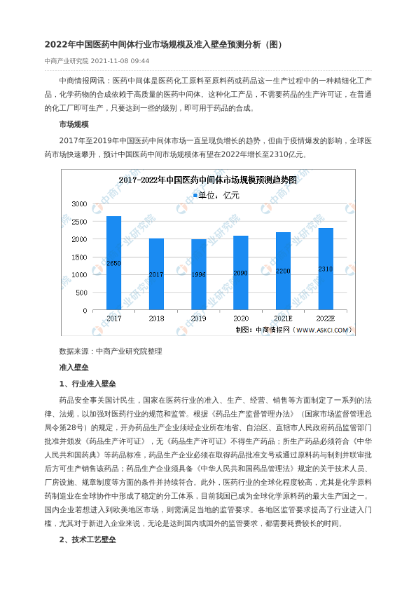 【中商产业研究院】【2022】2022年中国医药中间体行业市场规模及准入壁垒预测分析-2页