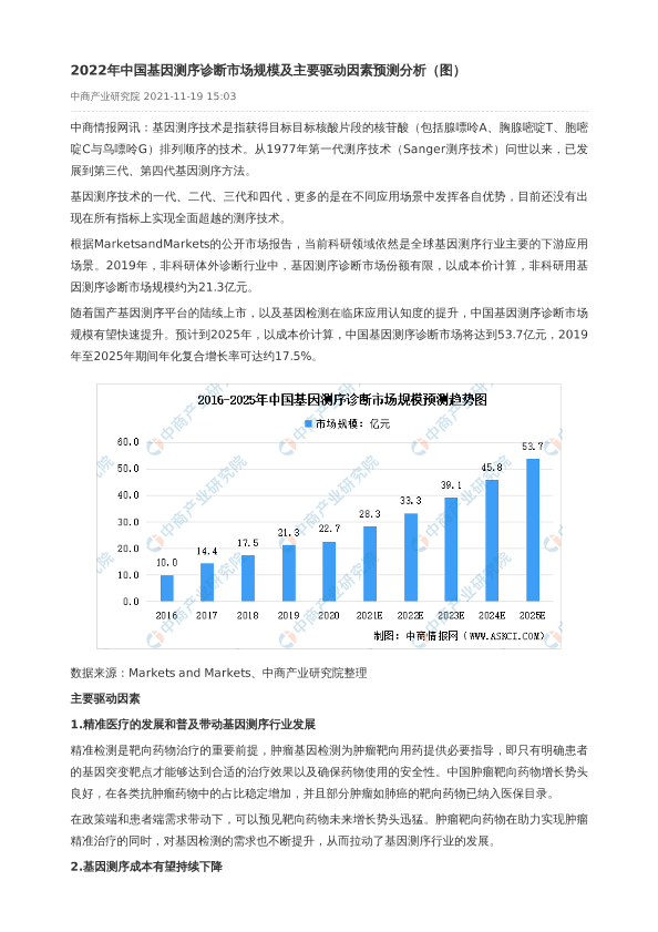 【中商产业研究院】【2022】2022年中国基因测序诊断市场规模及主要驱动因素预测分析-2页