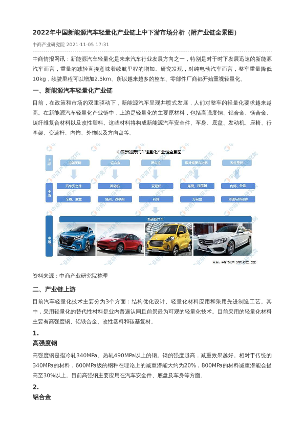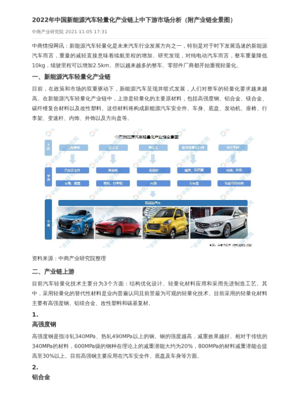 【中商产业研究院】【20211105】2022年中国新能源汽车轻量化产业链上中下游市场分析(附产业链全景图)-8页