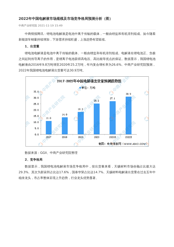 【中商产业研究院】【2022】2022年中国电解液市场规模及市场竞争格局预测分析-2页