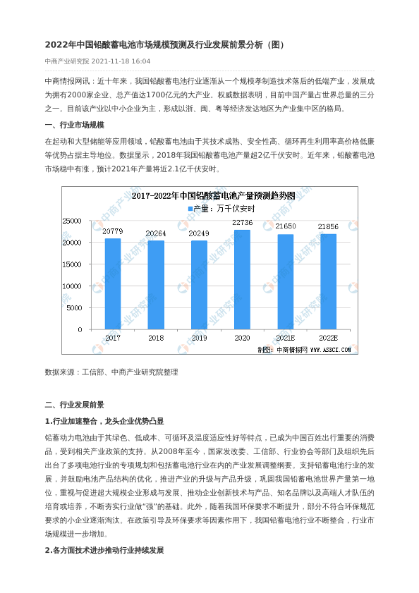 【中商产业研究院】【2022】2022年中国铅酸蓄电池市场规模预测及行业发展前景分析-2页