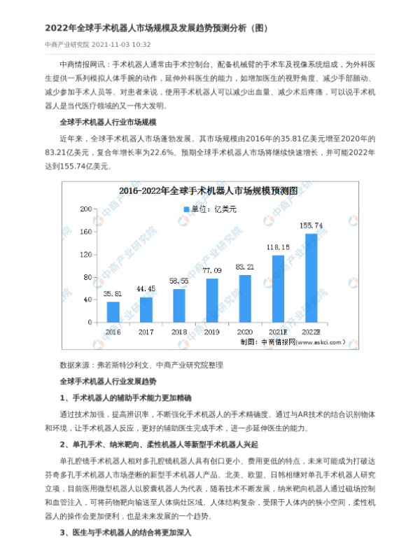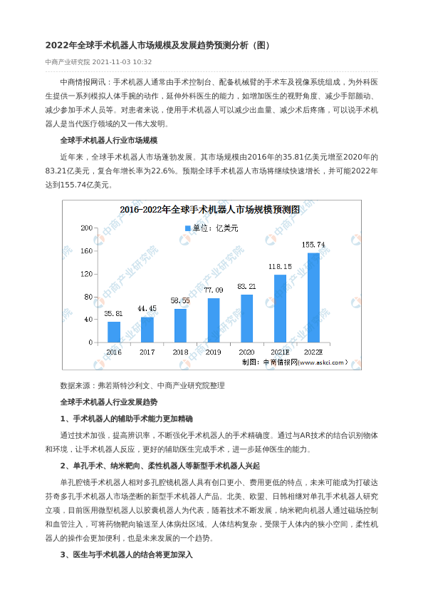 【中商产业研究院】【2022】2022年全球手术机器人市场规模及发展趋势预测分析-2页