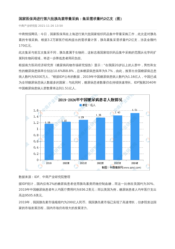 【中商产业研究院】【2021】国家医保局进行第六批胰岛素带量采购:集采需求量约2亿支-3页