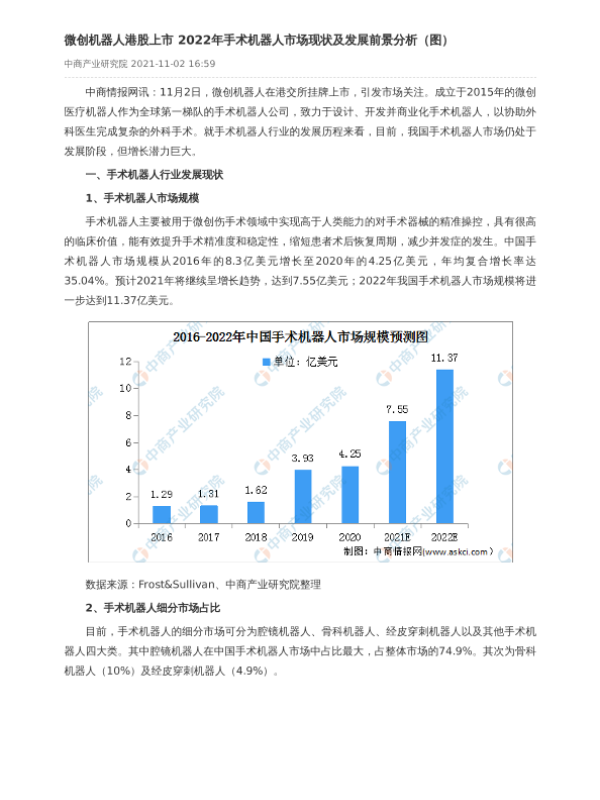 【中商产业研究院】【20211102】微创机器人港股上市 2022年手术机器人市场现状及发展前景分析-5页