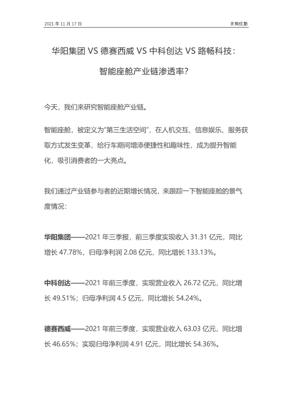 【优塾】【20211117】华阳集团VS德赛西威VS中科创达VS路畅科技:智能座舱产业链渗透率?-30页