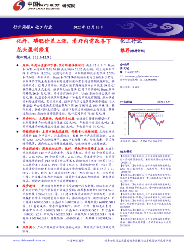 【银河证券】【20221210】化工行业周报:化纤、磷肥价差上涨,看好内需改善下龙头盈利修复-18页