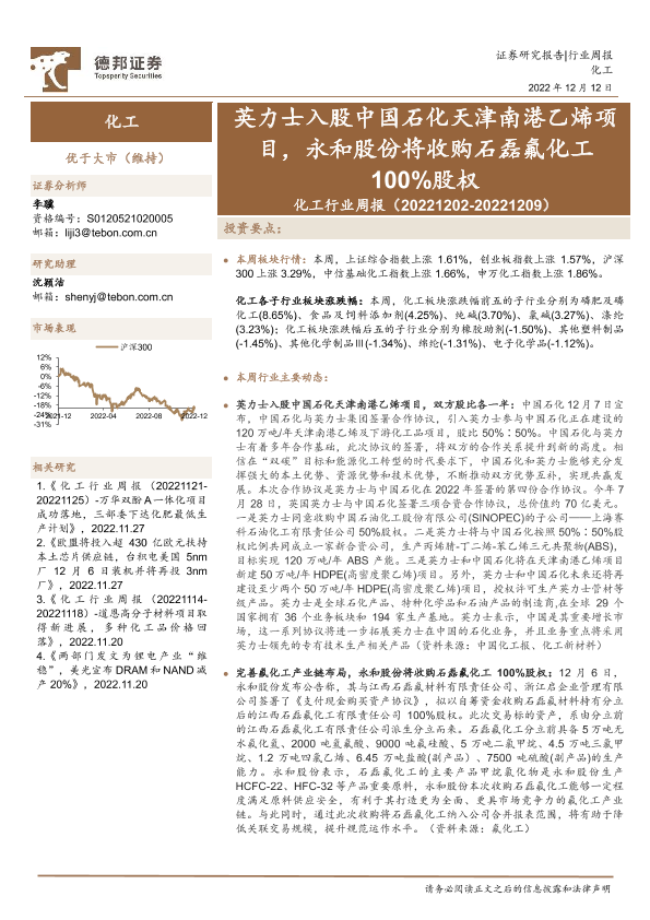 【德邦证券】【20221212】化工行业周报:英力士入股中国石化天津南港乙烯项目,永和股份将收购石磊氟化工100%股权-25页