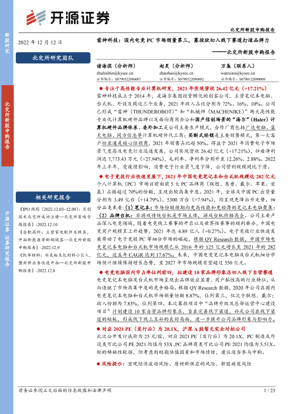 【开源证券】【20221212】北交所新股申购报告:雷神科技:国内电竞PC市场销量第三,募投欲切入线下赛道打造品牌力-23页