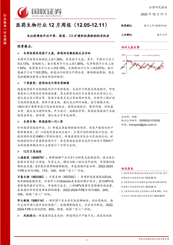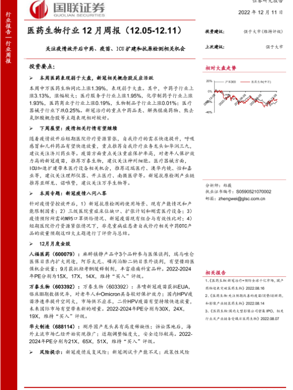 【国联证券】【20221211】医药生物行业12月周报:关注疫情放开后中药、疫苗、ICU扩建和抗原检测相关机会-16页