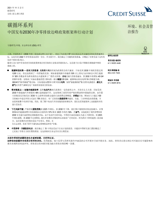 【瑞信】【20211102】亚太地区投资策略碳循环系列:中国发布到2030年实现净零排放的政策框架和行动计划-21页