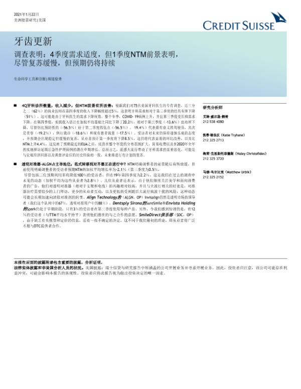 【瑞信】【20210122】美股医疗保健行业牙医调查显示:第4季度需求放缓,但第1季度NTM前景表明市场预期经济将继续复苏-58页