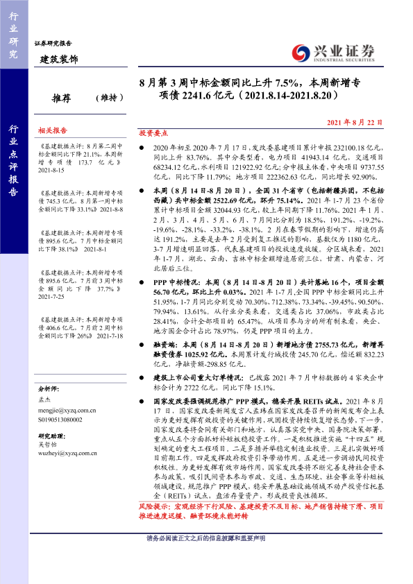 【兴业证券】【20210822】建筑装饰行业:8月第3周中标金额同比上升7.5%,本周新增专项债2241.6亿元-27页