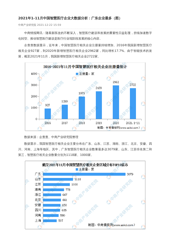 【中商产业研究院】【20211222】2021年1-11月中国智慧医疗企业大数据分析:广东企业最多(图)-2页