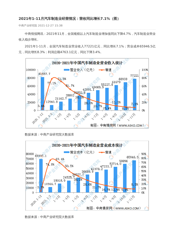 【中商产业研究院】【20211227】2021年1-11月汽车制造业经营情况:营收同比增长7.1%-2页