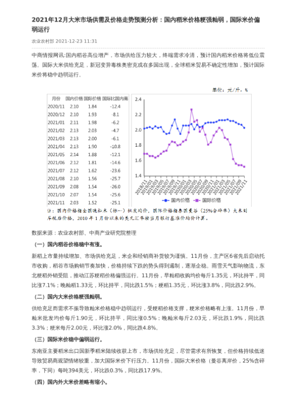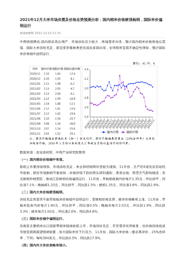 【中商产业研究院】【202112】2021年12月大米市场供需及价格走势预测分析-2页