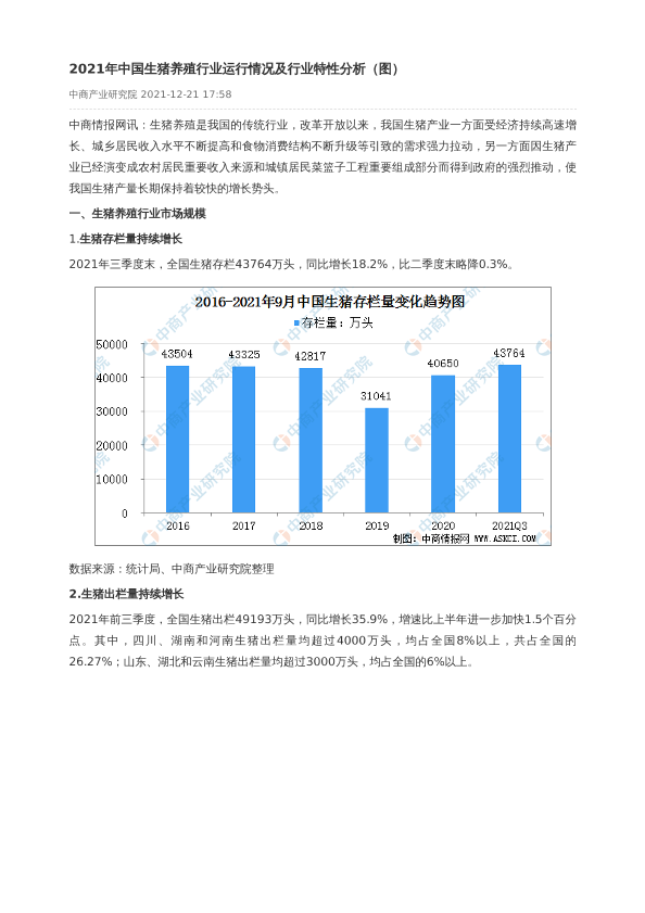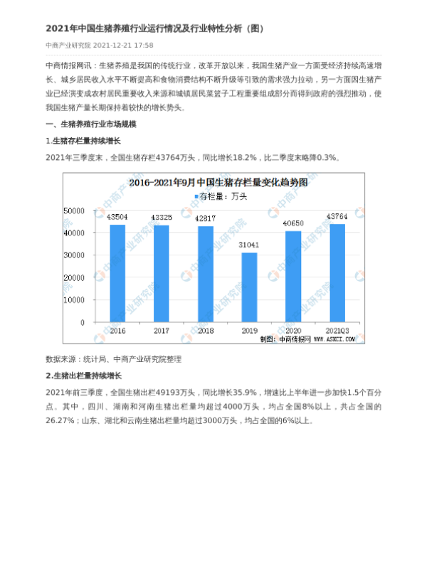 【中商产业研究院】【20211221】2021年中国生猪养殖行业运行情况及行业特性分析-6页