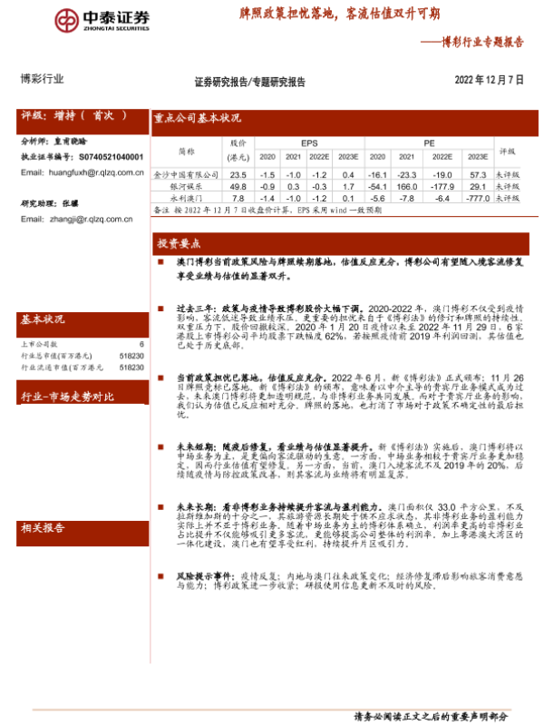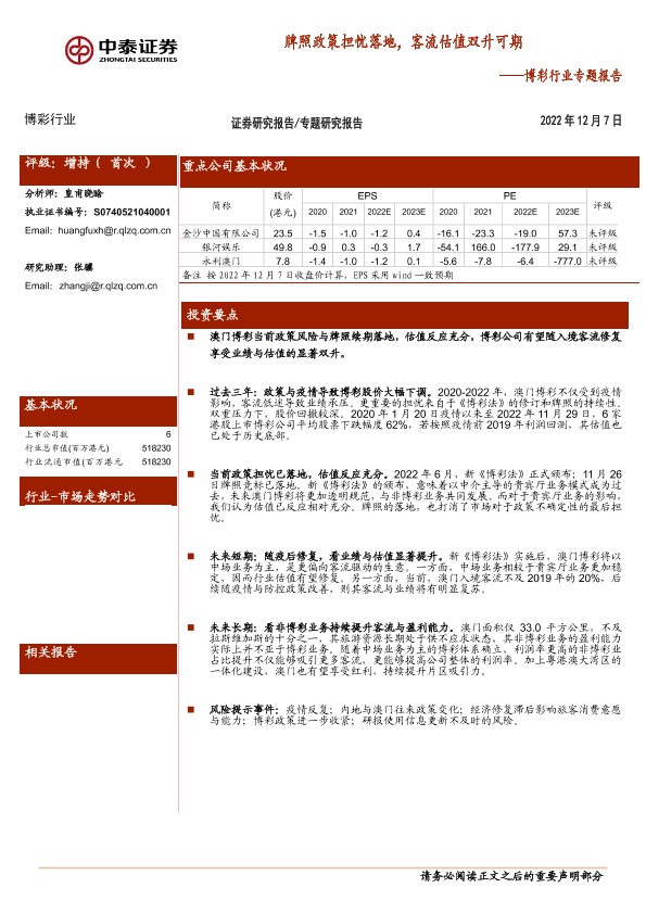 【中泰证券】【20221207】博彩行业专题报告:牌照政策担忧落地,客流估值双升可期-17页