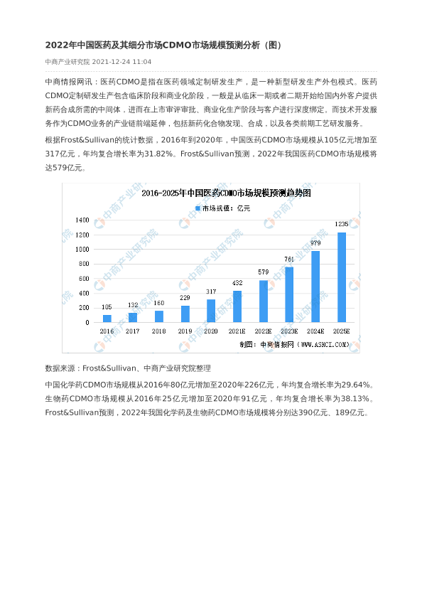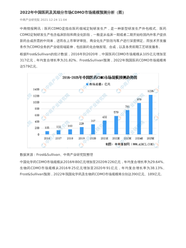 Frost&Sullivan 中商产业研究院 医药CDMO 市场规模 预测分析