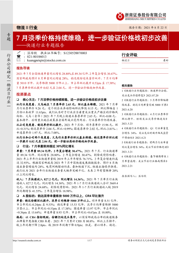 【浙商证券】【20210822】快递行业专题报告:7月淡季价格持续维稳,进一步验证价格战初步改善-17页