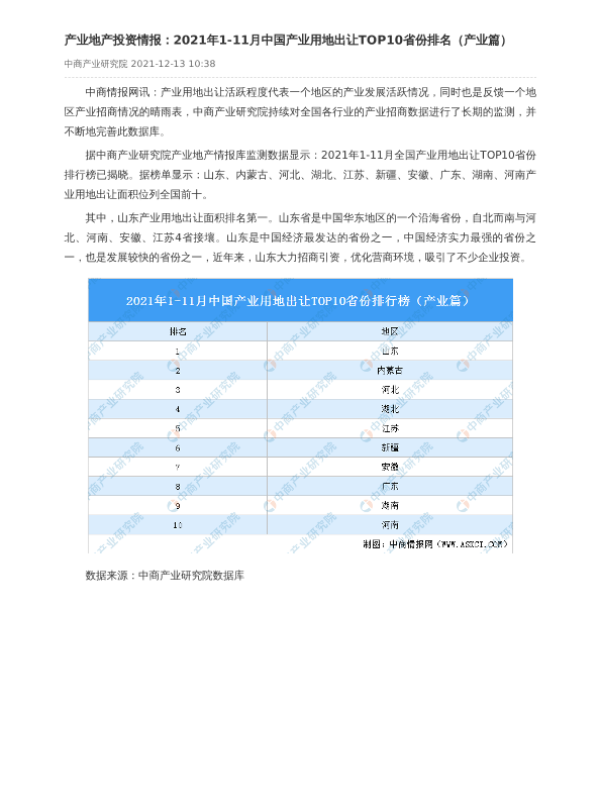 【中商产业研究院】【2021】2021年1-11月中国产业用地出让TOP10省份排名(产业篇)-1页