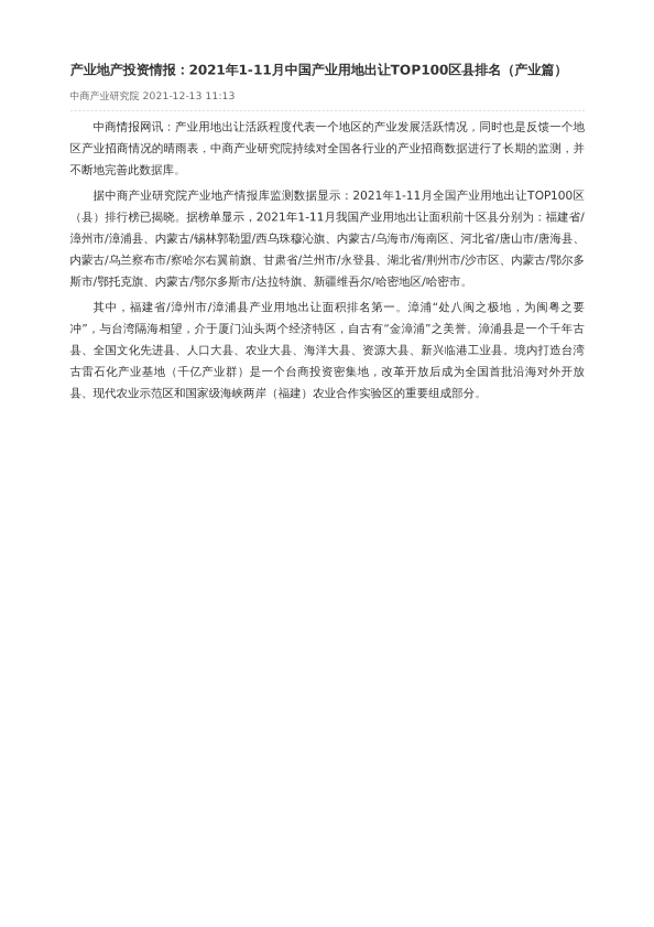 【中商产业研究院】【2021】2021年1-11月中国产业用地出让TOP100区县排名(产业篇)-4页