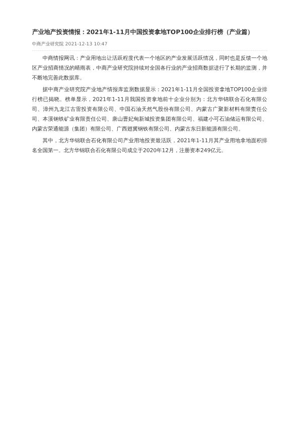 【中商产业研究院】【20211213】产业地产投资情报:2021年1-11月中国投资拿地TOP100企业排行榜-4页