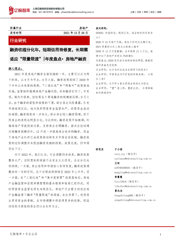 【亿翰智库】【20211220】融资收缩分化年,短期信用待修复,长期需适应“限量限速”_年度盘点·房地产融资-13页