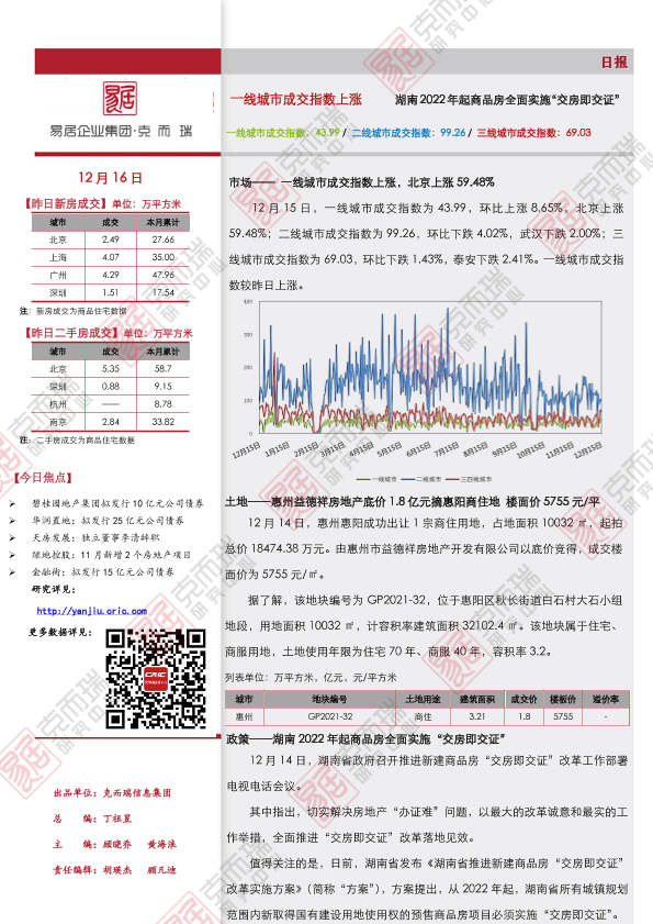 【克而瑞研究中心】【20211216】市场日报(1216):湖南2022年起商品房全面实施“交房即交证”-5页