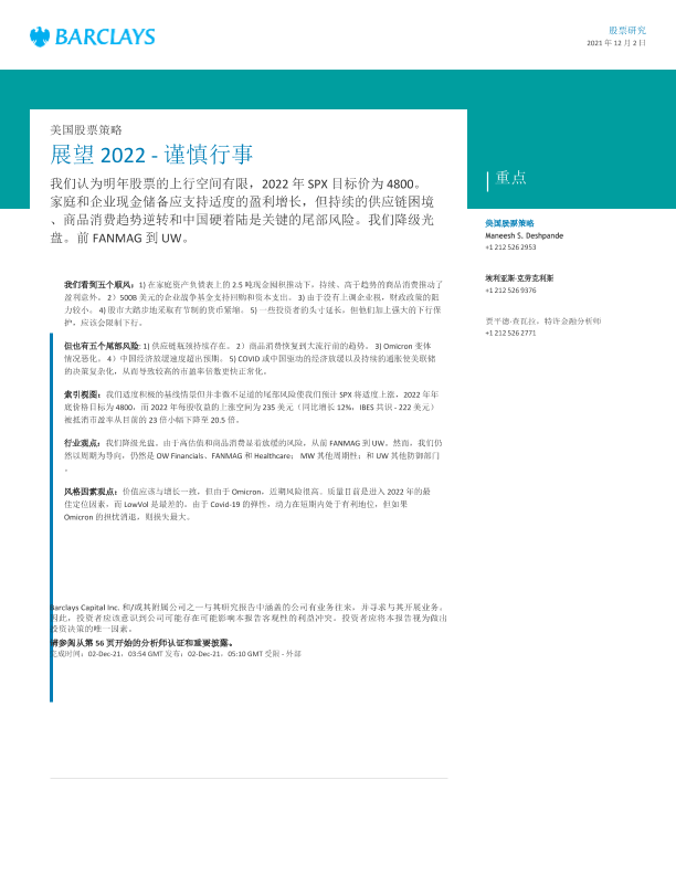 【巴克莱】【202112】美股投资策略2022年展望:谨慎行事-62页
