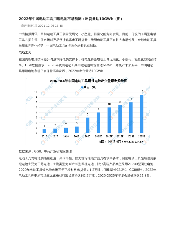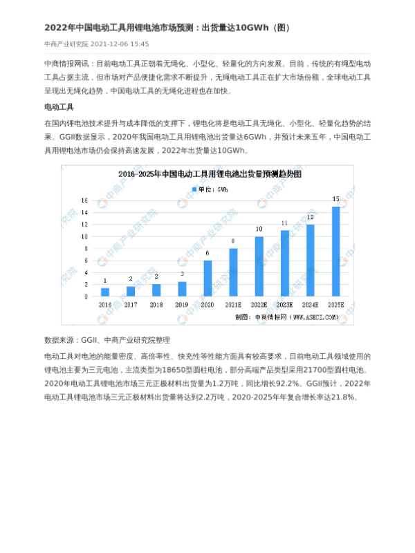 【中商产业研究院】【2022】2022年中国电动工具用锂电池市场预测:出货量达10GWh-3页