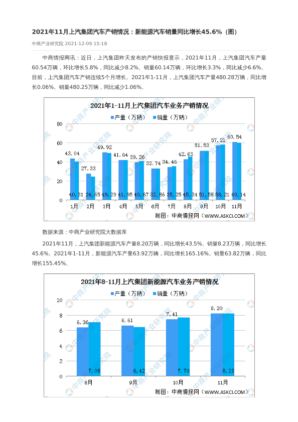 上汽集团 产销快报 新能源汽车 汽车产量 销量