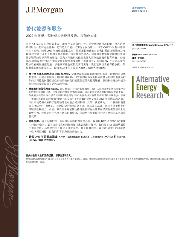【J.P. Morgan】【20211209】美股替代能源及服务业2022年展望:预计供应链逆风反弹,存储应加速-88页