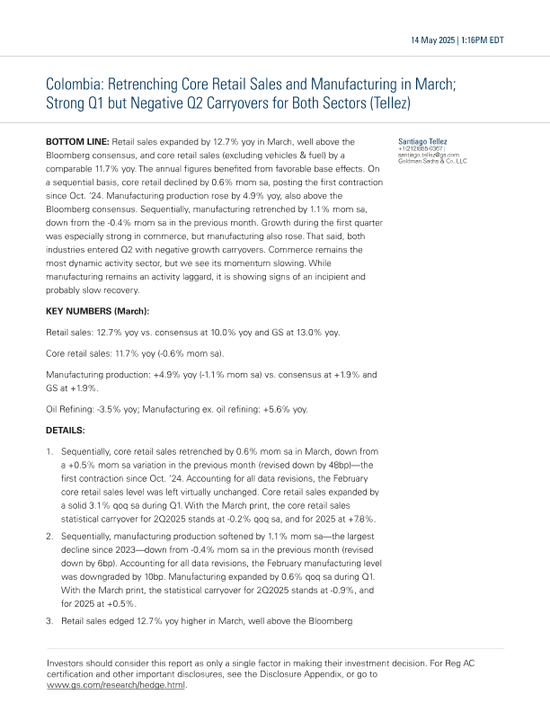 【Goldman Sachs】【20250514】Colombia Retrenching Core Retail Sales and Manufacturing in March; Strong Q1 but Negative Q2 Carryovers for Both Sectors-5页