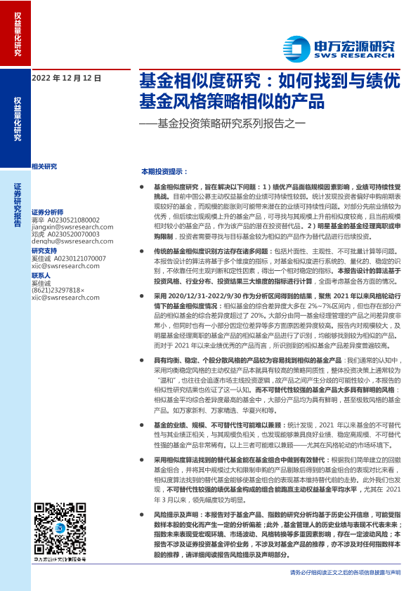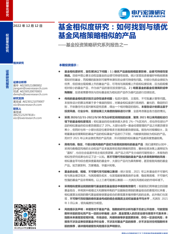 【申万宏源】【20221212】基金投资策略研究系列报告之一:基金相似度研究,如何找到与绩优基金风格策略相似的产品-30页