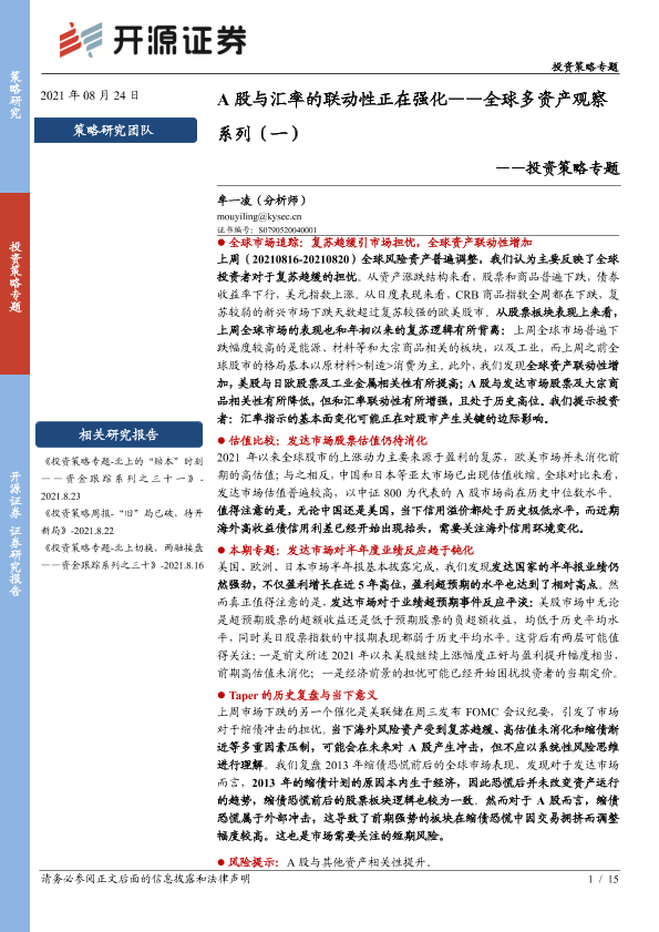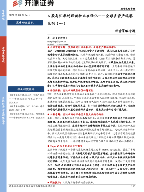 【开源证券】【20210824】投资策略专题:全球多资产观察系列(一),A股与汇率的联动性正在强化-15页