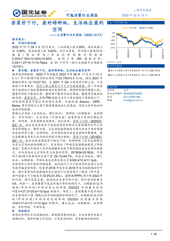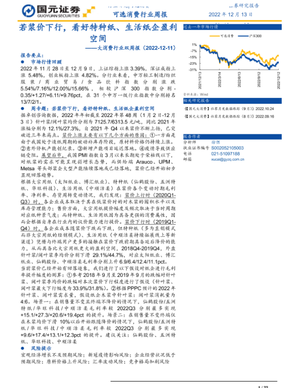 【国元证券】【20221213】大消费行业双周报:若浆价下行,看好特种纸、生活纸企盈利空间-22页