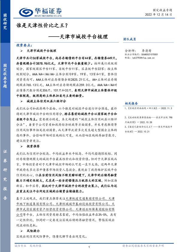 【华福证券】【20221214】天津市城投平台梳理:谁是天津性价比之王?-33页