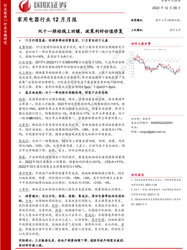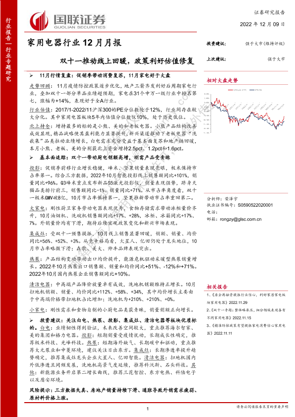 【国联证券】【20221209】家用电器行业12月月报:双十一推动线上回暖,政策利好估值修复-22页