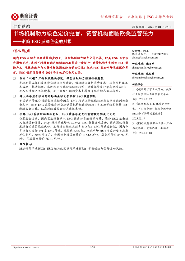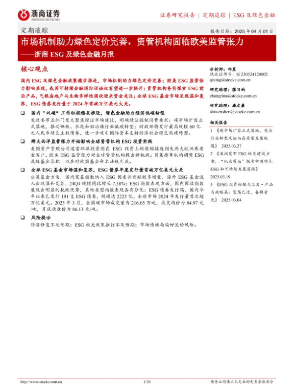 【浙商证券】【20250401】ESG及绿色金融月报:市场机制助力绿色定价完善,资管机构面临欧美监管张力-20页
